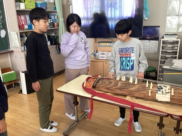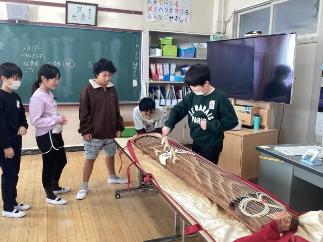 「春の海」で使われている琴が教室に入ってくると、見慣れない形や大きさに驚いていました。音楽の先生に琴の弾き方を教えてもらい、実際に鳴らしてみました。