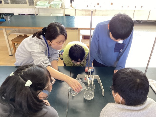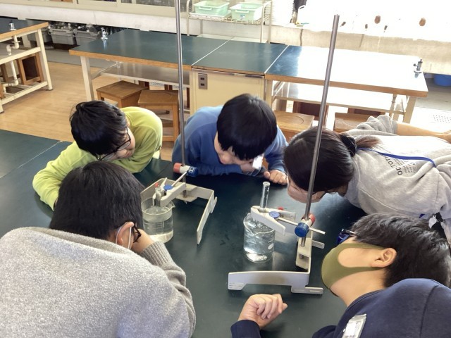 水で満たした試験管を、お湯や氷水の入ったビーカーに入れて、体積の変化を調べました。