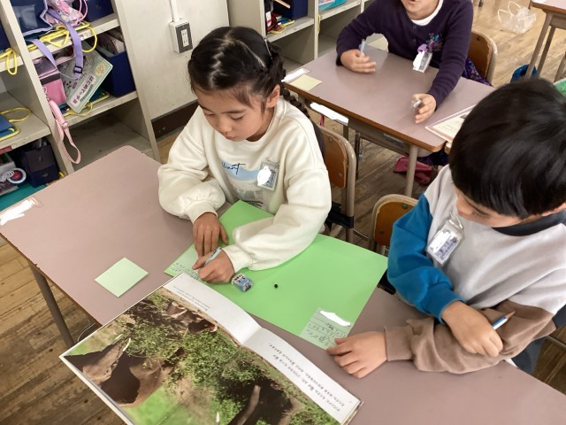 その学習の後に、図書室にあるほかの動物の赤ちゃんについて詳しく調べました。ペンギンの赤ちゃんは、お母さんと似ていなかったり、チンパンジーの赤ちゃんは、生まれつきお母さんに抱きつく腕の力があったりすることがわかりました。