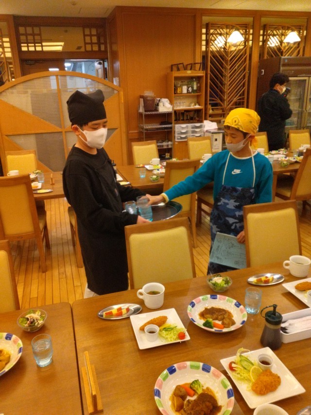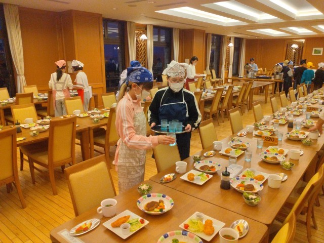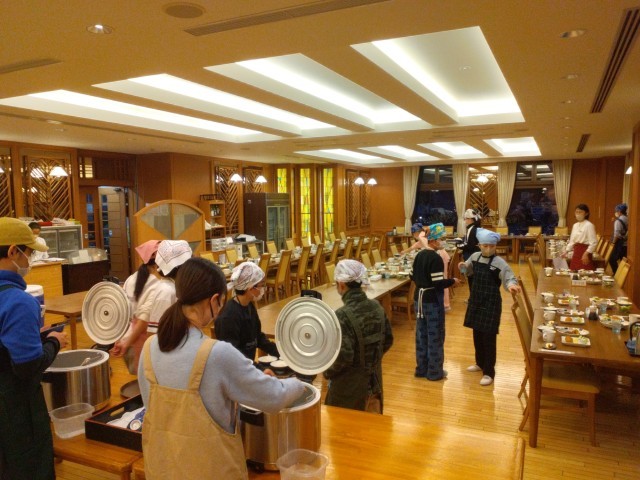 もうすぐ夕食です。食事係が初めての場所で、黙々と頑張っています。