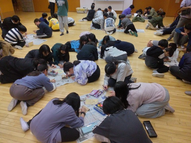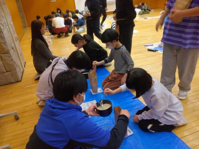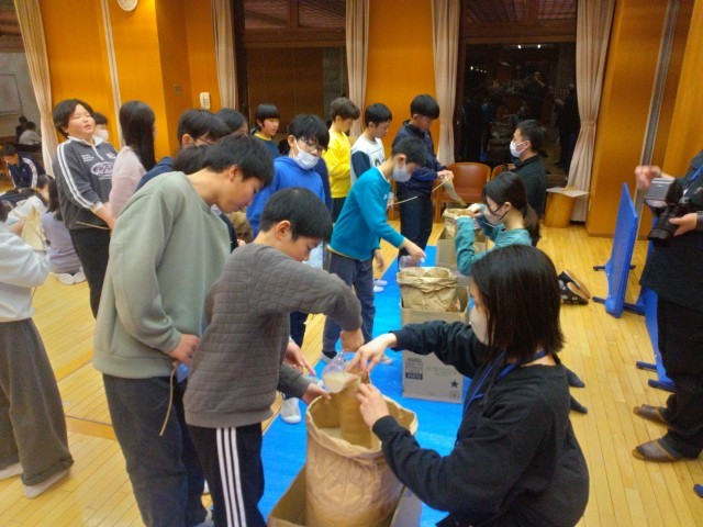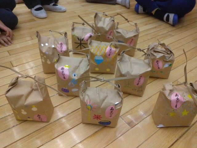 5年 ウインタースクール26 公開日 2026/02/18 更新日 2026/02/18 できごと 夜は、米袋づくりをしました。袋に自由にデザインし、そのあとに袋の重さを含めた1016gになるようお米を入れていきます。ペンやシールを駆使し、オリジナルの米袋を完成させました。残念ながらピタリ賞はいませんでしたが、1017gのニアピン賞が一人出ました!ちなみに、中身は、新潟県南魚沼産コシヒカリです!お土産で持ち帰ります! +3 いいね(103)