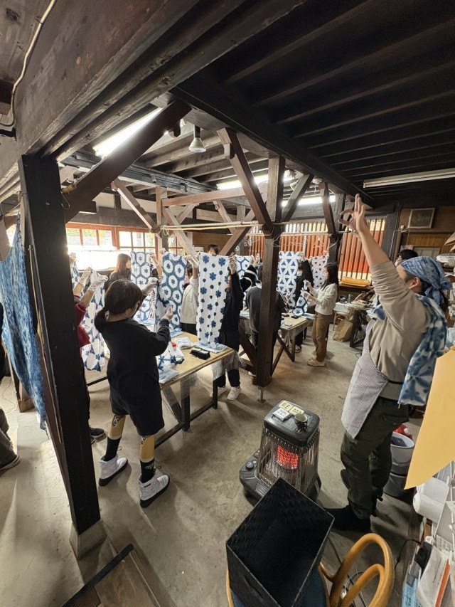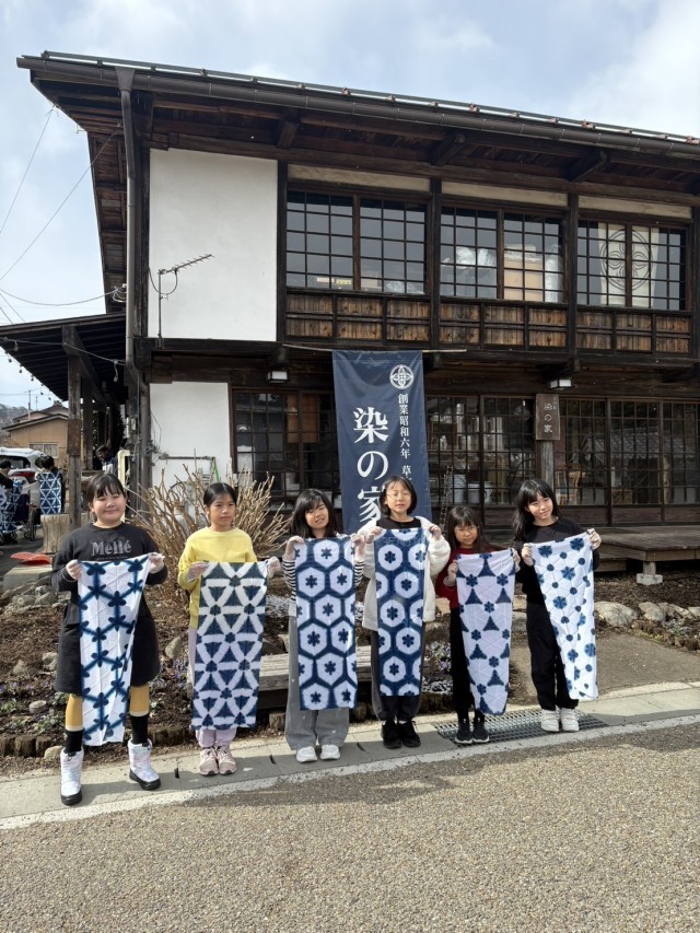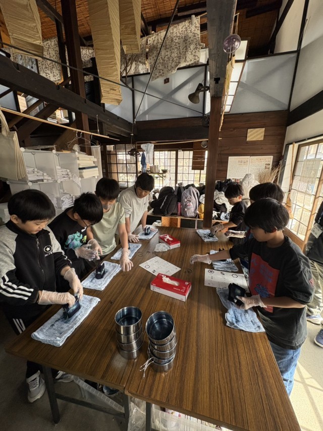 5年 ウインタースクール32 公開日 2026/02/19 更新日 2026/02/19 できごと 藍染めは、三角に折られた布の1.2箇所を30秒ずつ染料につけ、しぼります。その後タオルで巻き、余分な染料を取ってから手拭いを広げます。色の定着のため、手拭いを2分程空気に触れさせ、完成です。家に持ち帰った後、3日間は布を干し、乾かして色を定着させます。その後洗濯をして、再度乾かせば、使用できるようになるそうです。 +2 いいね(4)