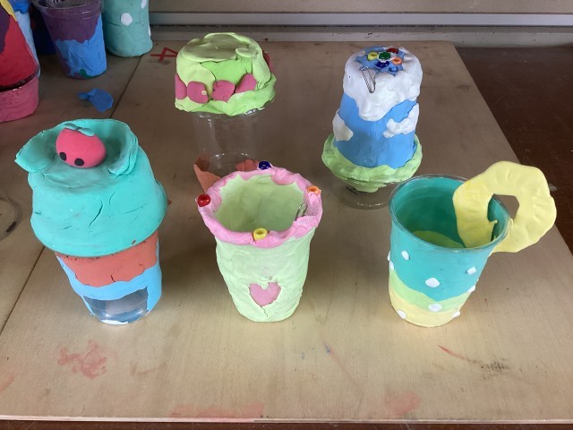 プラコップに色付けした紙粘土を貼り付けて、オリジナルの小物入れを作ります。