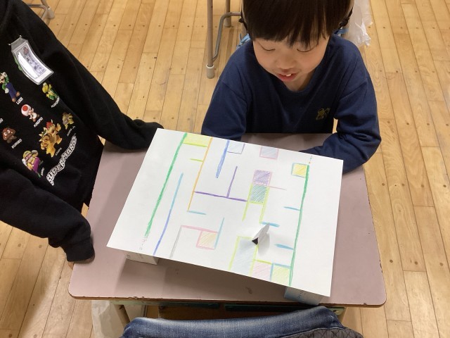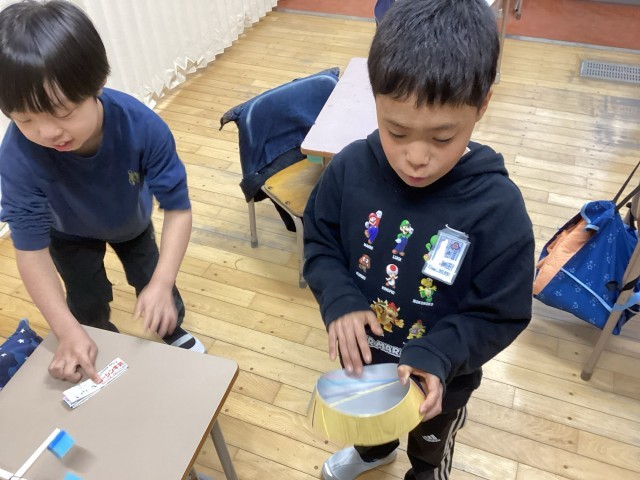 理科で学んだことを取り入れておもちゃを作ります。実際に遊んで興味をもった物を次回作る予定です。自分だったらここをこうしたいな…とイメージしながら遊んでいました。