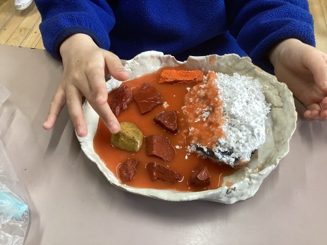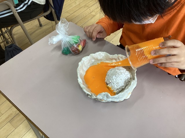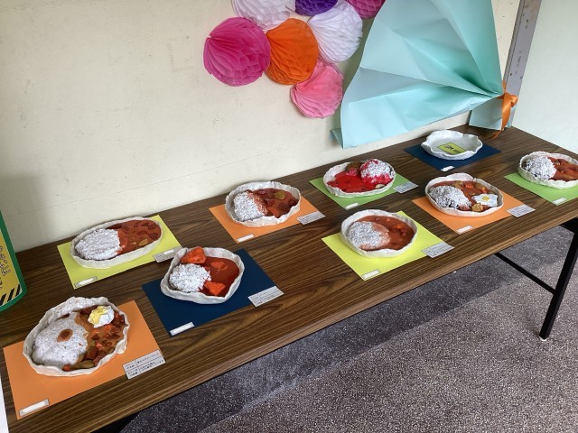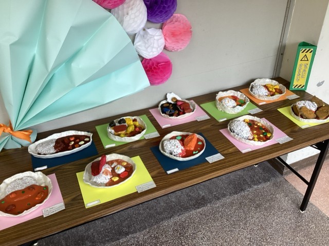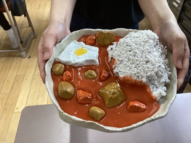 ご飯は理科で使ったパーライト、具材は学校や行船公園で拾った小石、ルゥはスライムで表現しました。