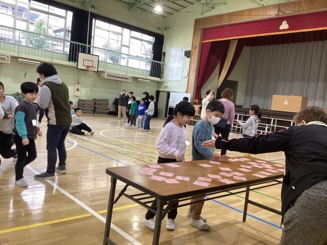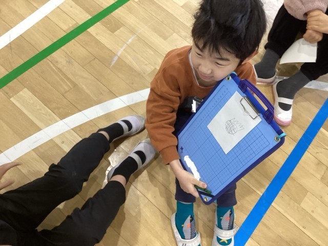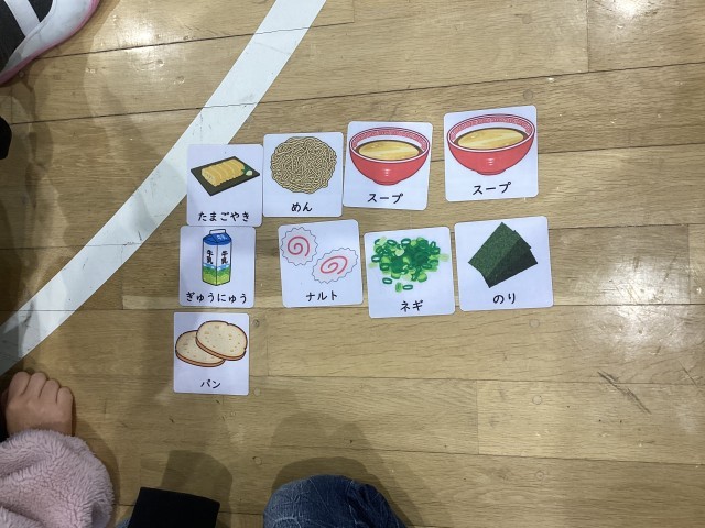 今回のゲームは、「お絵描き伝言ゲーム」と「お買い物じゃんけん」でした。お絵描き伝言ゲームでは、最後の人に伝わったイラストがお題と異なるチームもありましたが、それも含めてとても楽しく過ごせました。お買い物じゃんけんは、2学期に5・6年が紹介してくれて「またやりたい。」という声が多く、今回やることになりました。ラーメンの具材が全て揃うと、グループみんなで歓声をあげて盛り上がりました。