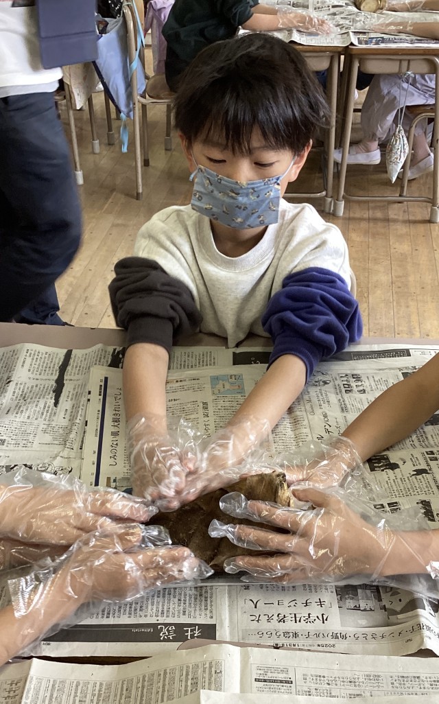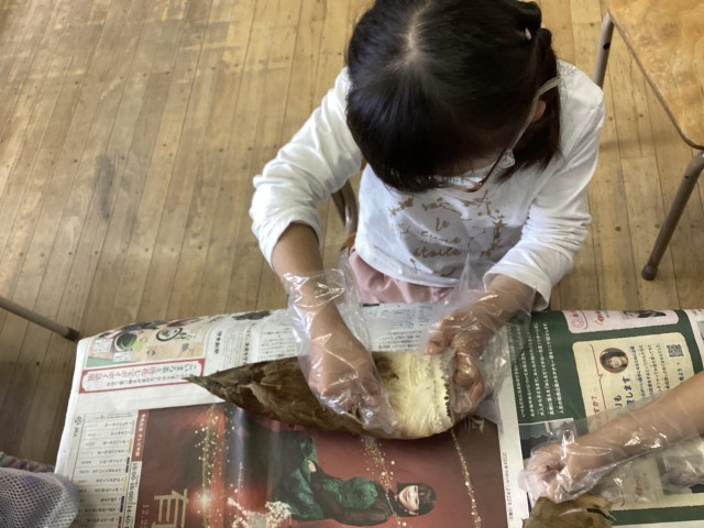 筍の皮剥き体験をやりました。「皮を剥く前の筍を見るのが初めて!」と皮剥きをする前から目がキラキラしていました。皮が分厚いことに気付いたり、筍の香りを楽しんだりしていました。剥いた皮で小さなミニ筍を作って楽しむ姿も見られました。