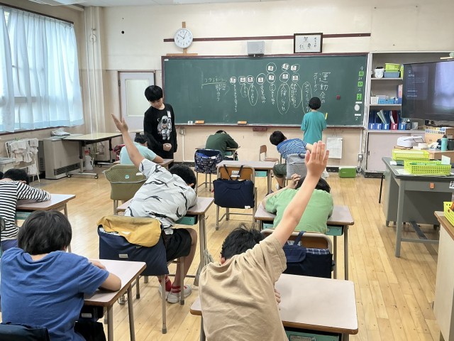 運動会のスローガンを、みんなで意見を出し合って考えました。積極的に手を挙げて発言したり、司会がリードしながら決め方について話し合ったりして、スローガンを決めました。