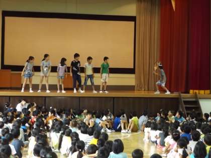5年生は劇を交え、某有名元テニス選手に扮して仲間を励まし、記録会への意気込み示しました。
