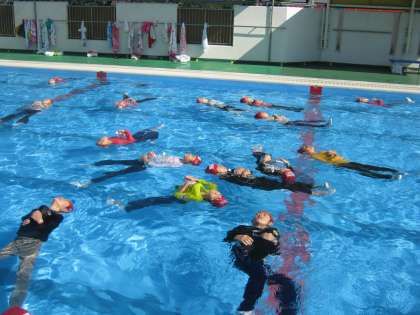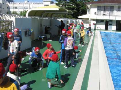 ペットボトルなどで長く浮く練習や、服が水を吸って動きにくくなる体験をして、