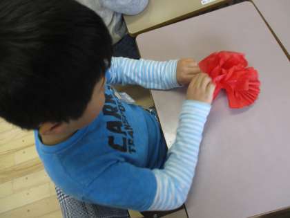 もうすぐ6年生を送る会があります。6年生に喜んでもらえるように、1〜5年生のみんなは飾りつけなど準備しています。お花紙を丁寧に開いて、お花を作りました。