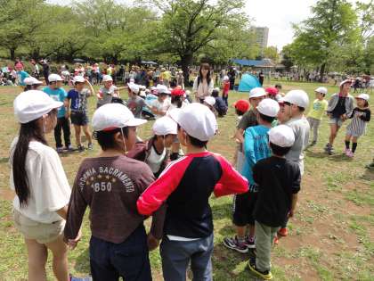 4月28日(金)に、全校遠足で木場公園に行きました。お天気にも恵まれて、気持ちの良い1日になりました。初めての1年生も、手をつないでいっしょうけんめい歩きました。きょうだい学級あそびでは、ドロケイやこおりおになどで走り回りました。