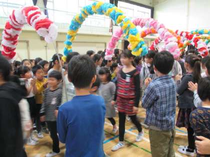 3年生からぴょんぴょんがえるのプレゼントをもらったら、今度は1年生の出番です。