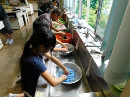 家庭科では,今,「快適な住まい方や着方をしよう」という学習をしています。その一環として,本日,洗濯の実習をしました。Tシャツの手洗いをしました。「洗濯機のありがたみがわかった」といった声も聞かれました。梅雨の晴れ間の中,きれいになった洗濯物が気持ち良さそうでした。