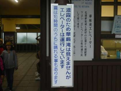 6年生 移動教室2日目 #18 公開日 2019/07/04 更新日 2019/07/04 できごと 音は聞こえるものの,滝は,全く見えませんでした。戻ってくると,看板は“見えません”に変わっていました。帰りのいろは坂も雲の中という感じでした。 いいね(0)