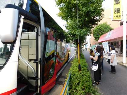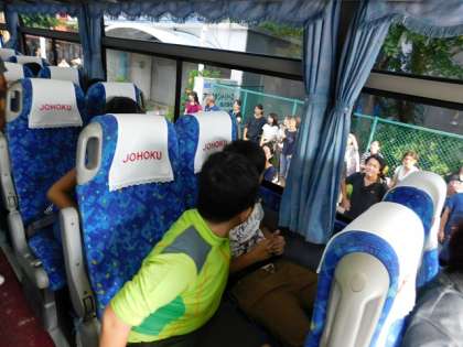 昨日の台風15号に伴う休校により,3連休明けの実施になりました。しかし,これまでの準備がしっかりできていたため,戸惑うことはなかったようです。スモークガラスのため,バスの中からは外はよく見えるのですが,外からは見えにくかったようです。それでも一所懸命お子さんを探し,手を振る保護者の皆さんに,5年生はとても勇気づけられたと思います。