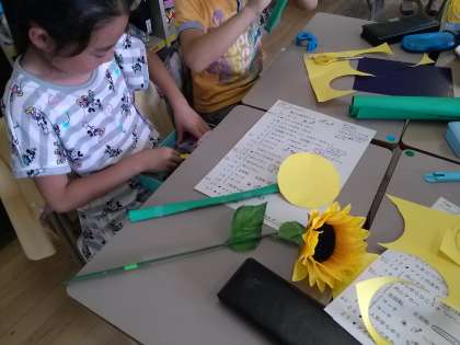 撮影の合間の時間をつかって、パレード練習用のひまわりを作りました。