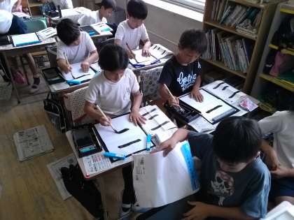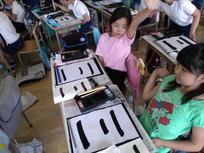すずりに墨を入れて、筆に墨をつけて、したたらないように墨汁を切って、書きました。