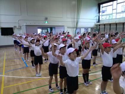 ザ・サンカサイ 公開日 2014/05/21 更新日 2014/05/21 できごと 5月21日(水) 20分休みには、体育館でザ・サンカサイの練習がありました。今日は中学年の練習日です。 ステージの上に5・6年生の係のお兄さん お姉さんが立ち、教えてくれる通りに体を動かしました。 ♪ みんな集まれ さ〜んかさい 音頭に合わせて楽しくおどりました。 いいね(0)