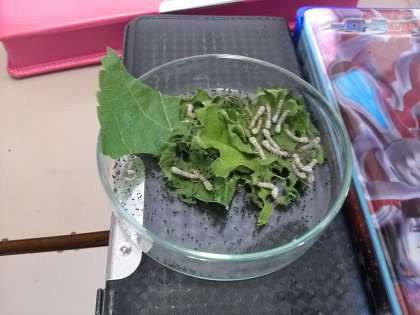カイコです。日々大きくなっています。体育館わきからつんできたクワの葉を毎日むしゃむしゃ食べています。