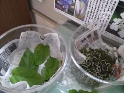 何十匹もいるので、移しかえるのも大変です。新しい葉っぱを近づけて数分放っておくと、カイコ数匹がその葉っぱに かじりついています。それを繰り返して全員新しい桶に引っ越し完了です。