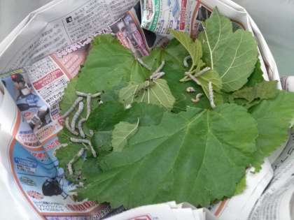 カイコを育てている桶の底が 食べ終わった葉の茎やフンでいっぱいになってきたので、