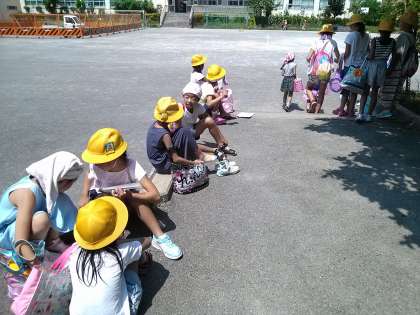 右が、帰りにプールの入り口前でくつしたをはいているみなさん。