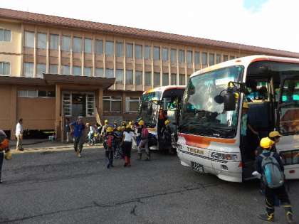 宿舎である「浅草山荘」には,予定より40分ほど遅い16:37に着きました。雨天のため,稲刈り体験に時間がかかったのが,原因です。「開校式」では,お世話になる管理人さんに,大きな声であいさつができました。