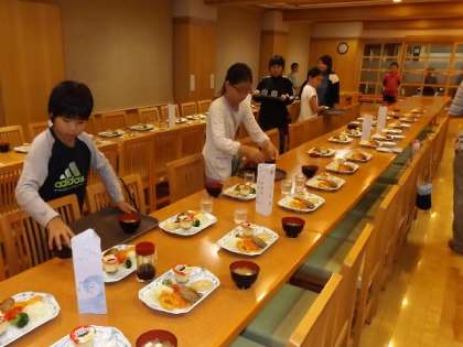 食堂で準備をする食事係です。初めてのためか,少々手間取っていました。それでも一所懸命仕事をする姿勢に感心しました。