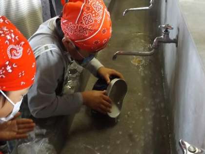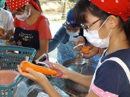 飯盒でご飯を炊いた経験のある子は意外と多いようでした。野菜の処理には,ピーラーが大活躍でした。