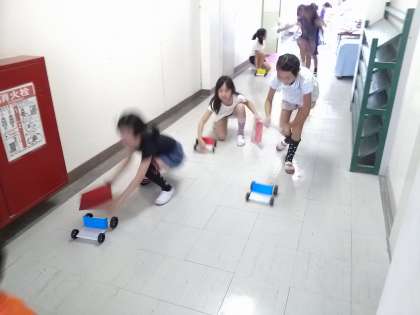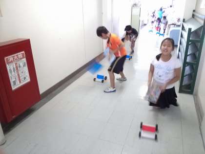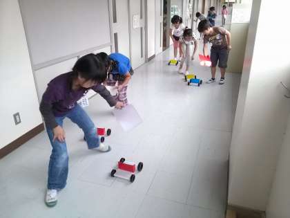 ただいま、帆のついた車を使った実験中です。