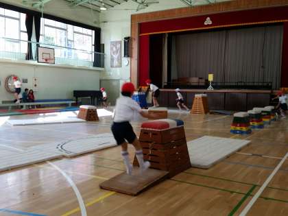 とび箱運動とマット運動を学習したので、今日はとび箱とマット、ろくぼくと平均台を並べてアスレチックサーキットにチャレンジしました。