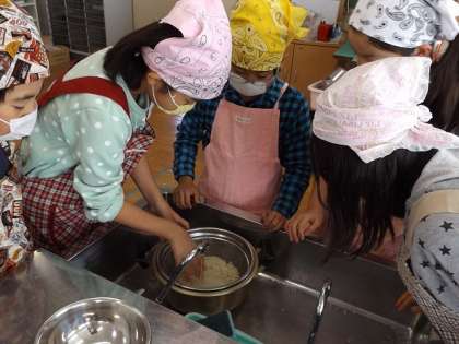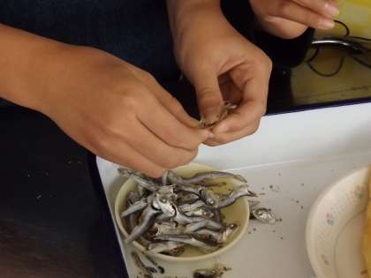 5年生の今学期最後の調理実習は,ご飯を炊き,味噌汁を作りました。味噌汁の出汁は,煮干しで取りました。まず,頭と内臓を除きました。