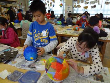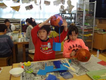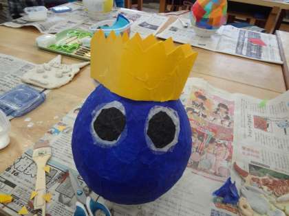 風船を紙で固めて作った たまごがいろいろな姿に変身しています。