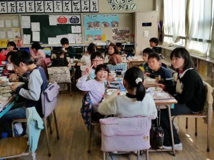 各クラス5名の6年生を招いて、一緒に給食を食べました。