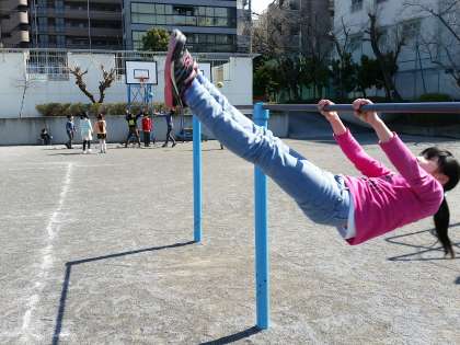 鉄棒の蹴上がりに挑戦している子もいます。難しい技なので根気強く練習することが大切ですが、成功を目指してがんばってほしいです。