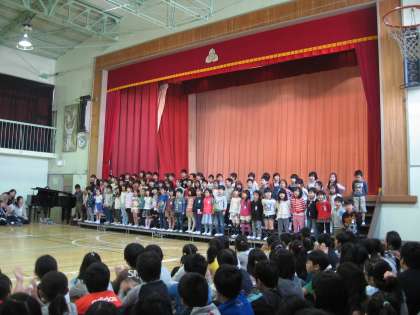 1年生にとっては月曜日の朝会から数えて2回目の全校で集まる場だったため、最初は緊張した表情もありましたが、5年生の「学校のルール」の劇や各学年の紹介を見たり、聞いたりしているうちに、みんなが笑顔を見せ、学校のことのクイズではとても盛り上がりました。