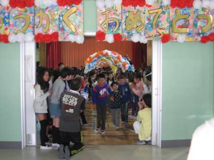 6年生と手をつないで、うれしそうに体育館に入場しました。