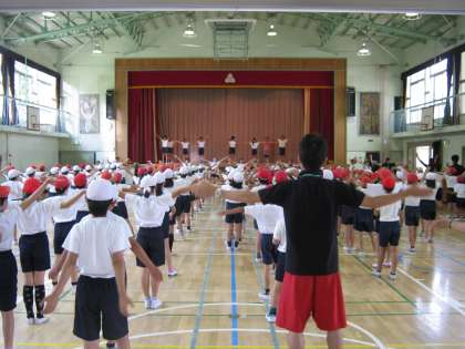 振り付けを担当している運動会係児童の子供たちがステージに上がって振り付けを見せてくれました。