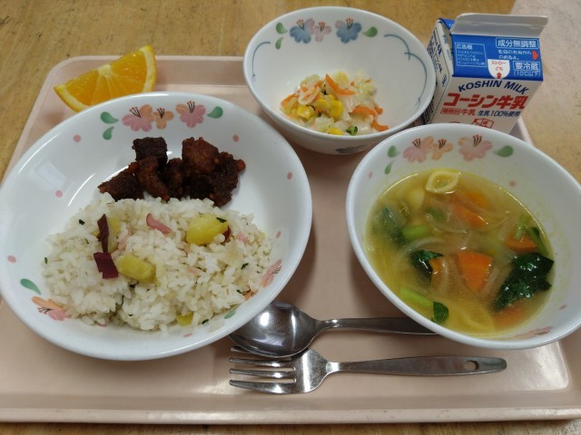 今日は、洋食の献立です。どの献立も子どもたちの好きな味付けだったため、多くのクラスでたくさん食べてくれていました。特に小松菜とマカロニのスープには、カレー粉が入っていたため、スパイシーな味付けでした。この味は高学年の子たちには特に人気だったようで、高学年のスープ食缶は空っぽのクラスが多かったです。