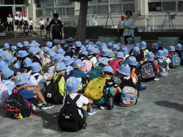 10月3日(金)、絶好の天候に恵まれて1年生にとっては小学校生活はじめての生活科見学。朝からとても気持ちが高ぶっていた1年生ですが、出発式の時は気持ちを切り替え、しっかりお話を聞いていました。今日の予定や注意事項を確認し、いざ出発! お見送りの先生方に元気よく「行ってきます!」と挨拶していました。