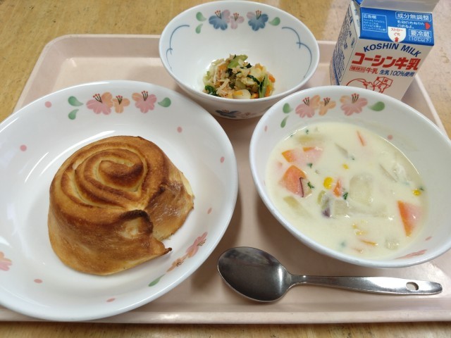 今日は給食室で手作りしたパン生地にメープルバターシロップをぬって作った「手作りメープルバターロール」です。作っている午前中は、給食室周辺の廊下や職員室まで甘い香りが漂っていたので、「甘い匂いがするー」や「キャラメル?っぽい匂いがしてお腹がすいたー!」などという会話を、子どもたちも先生たちも楽しそうにしていました。返却されたパンの食缶が空っぽのクラスが多かったので、子どもたち好みの味付けだったようです。