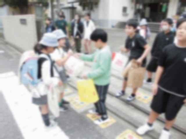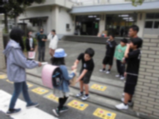 10月10日(金)登校時の校門の様子です。今日は月1回実施の親子リサイクルの日です。PTA役員の方々のご協力のもと、環境委員会児童が家庭から持ってきてくれたリサイクル品(ダンボールや牛乳パック等)を回収しています。今日も元気よく「おはようございます!」と挨拶してから、リサイクル品を受け取っています。