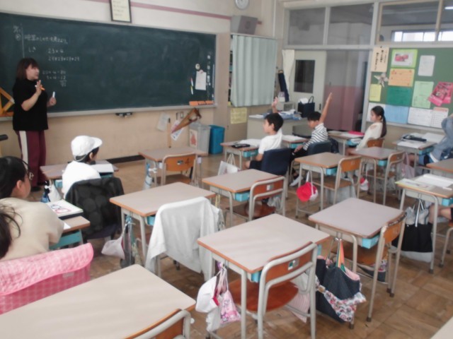 10月17日(金)2校時、3年算数(少人数)の授業の様子です。今日は、「かけ算の筆算」の学習を行いました。これまでに学習した2桁×1桁の学習を活かして、「23×4」を筆算で行う方法について考えました。「23を20と3に分けると計算しやすい」という児童の発言をもとに、23×4を20×4と3×4に分けて計算し、それぞれの答えを合わせて答えを出していました。暗算の仕方をマスターすると、次々に新たな暗算問題にチャレンジしていました。