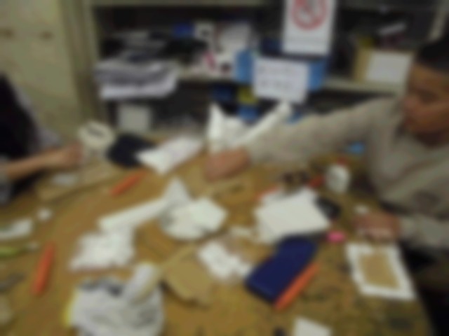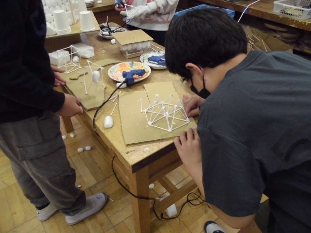 5・6時間目で面白い立体を貼る材料や形を工夫してつくる授業をしていました。綿棒、発砲スチロール、針金、段ボール、、、いろいろな素材を適した接着剤で貼り付けます。大きな作品、繊細な作品、力強い作品、、、。黙々と自分のつくりたい作品をつくる姿が職人さんのようで素敵でした。展覧会が楽しみです。
