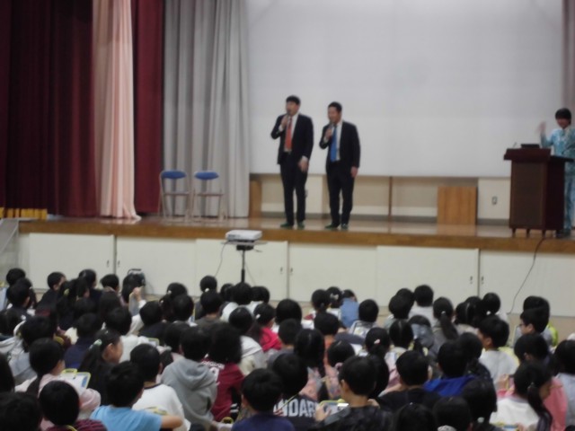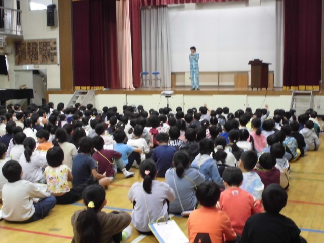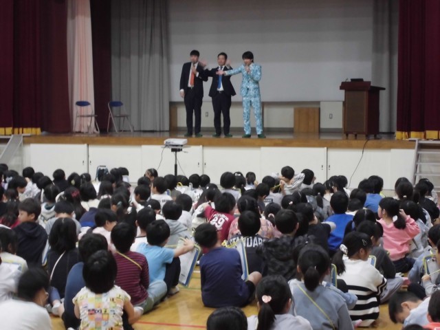 10月24日(金)3~4校時、「笑顔と学びの体験プロジェクト」を実施しました。今回はお笑い芸人さん3名による「漫才体験」をしました。漫才師によるお手本をもとに、児童がペアやトリオになって、オリジナル漫才を作り発表しました。きれいに立つこと、声を大きく出すこと、表情を豊かにすること…等、漫才を上手に発表することを教わると、真剣に練習に取り組んでいました。代表児童による発表もあり、大変盛り上がりました。
