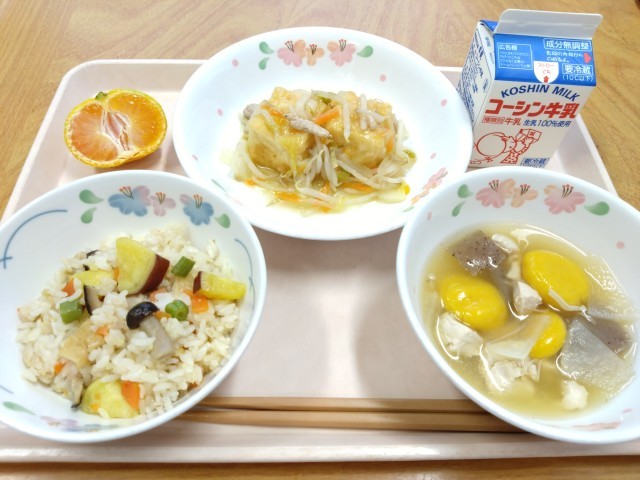 十三夜とは、十五夜の次に美しい月が見られる日で、作物をお供えして秋の収穫に感謝する日本で生まれた風習です。そこで、今日は少し早いですが、11/2の十三夜にちなんで黄色い白玉団子をお月様に見立てた「かぼちゃ白玉汁」を提供しました。かぼちゃ白玉は、給食室で白玉粉とかぼちゃ、豆腐を混ぜ合わせた後、1つ1つ丸めて手作りしています。もちもちした白玉の入った汁物は学年問わず人気で、各クラスの汁物の残食は少ない傾向でした。