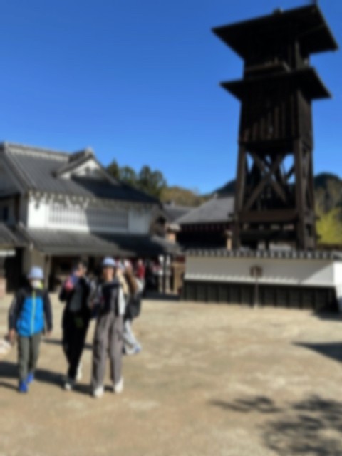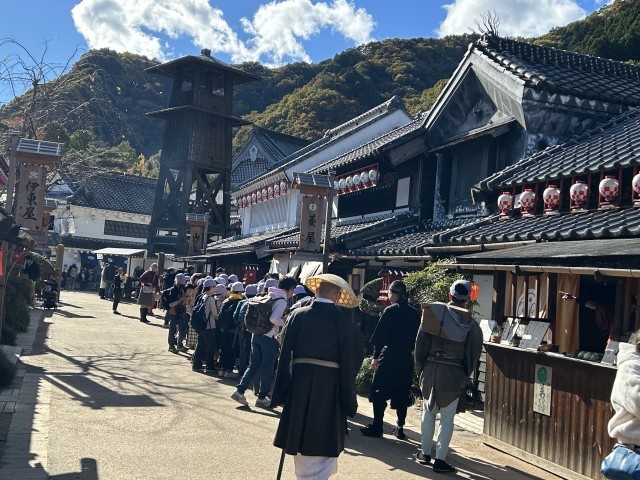 関所を越えて、日光江戸村に入りました。各班ごとに思い思いの場所を巡り楽しんでいます。お化け屋敷がとても人気です! 江戸の街並みを堪能しています。