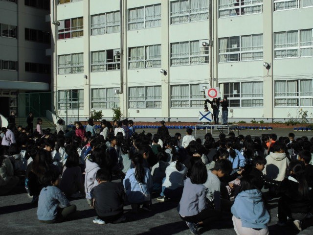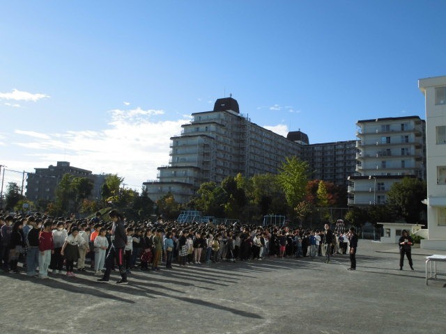 今朝は、校庭で○×クイズの児童集会がありました。次の問題他が出され、○だと思ったら立ち、×だと思ったら座ると集会委員から説明されました。「六小で飼っている動物は、金魚とうさぎだけである。」、「六小は、今年創立50周年である。」、「六小には、髙橋先生が3人いる。」等々。皆さんは正解は分かりますか?児童は、秋の朝の一時を楽しみました。