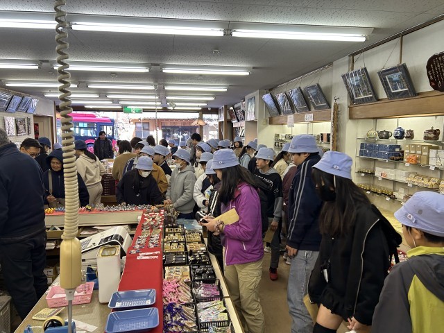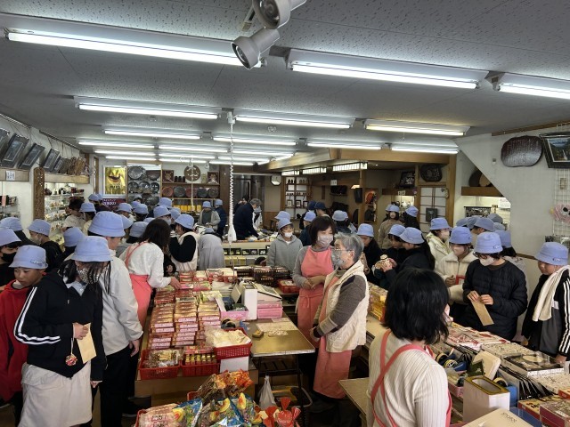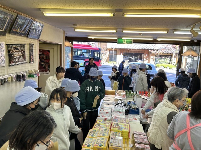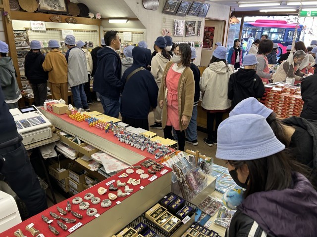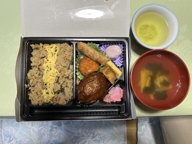 昼食のメニューは、炊き込みご飯、ミニ春巻き、鶏唐揚げ、スパゲッティ、ハンバーグ、デミグラスソース、八幡巻、厚焼き玉子、錦糸卵、桜漬け、一口まんじゅう です。食後はお楽しみのお土産購入タイムです。